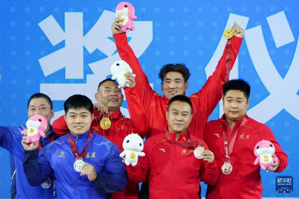 11月19日,获得冠军的江苏队球员钱飞翔(右三)、获得亚军的福建队球员赵永超(左二)、获得季军的陕西队球员刘欣欣(右)在颁奖典礼上与教练合影。当日,第十五届全运会男子举重96公斤级决赛在东莞举行。新华社记者 杨晨光 摄 11月19日,江苏队球员钱飞翔在一场干净利落、充满活力的比赛中成功举起后庆祝。他赢得了冠军。当日,第十五届全运会男子举重96公斤级决赛在东莞举行。新华社记者 杨晨光 摄 11月19日,福建队选手赵永超参加抓举比赛。他获得了第二名。当日,第十五届全运会男子举重96公斤级决赛在东莞举行。新华社记者 杨晨官 摄11月19日,江苏队选手钱飞翔参加抓举比赛。他赢得了冠军。当日,第十五届全运会男子举重96公斤级决赛在东莞举行。新华社记者 杨晨光 摄 11月19日,获得冠军的江苏队球员钱飞翔(右三)、获得亚军的福建队球员赵永超(左二)、获得季军的陕西队球员刘欣欣(右)在颁奖典礼上与各自的教练合影。当日,第十五届全运会男子举重96公斤级决赛在东莞举行。新华社记者 杨晨光 摄 11月19日,钱飞翔参加抓举比赛的江苏队选手。他赢得了冠军。当日,第十五届全运会男子举重96公斤级决赛在东莞举行。新华社记者杨晨光11月摄19日,江苏队球员钱飞翔在干净利落、充满活力的比赛中成功举起后庆祝。他赢得了冠军。当日,第十五届全运会男子举重96公斤级决赛在东莞举行。新华社记者 杨晨光 摄 11月19日,福建队选手赵永超在挺举比赛中失利。他获得了第二名。当日,第十五届全运会男子举重96公斤级决赛在东莞举行。新华社记者 杨晨光 摄 11月19日,福建队选手赵永超进行挺举比赛。他获得了第二名。当日,第十五届全运会男子举重96公斤级决赛在东莞举行。新华社记者 杨晨光 摄