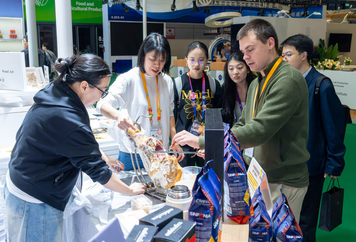 氧2025年11月5日,第八届中国国际进口博览会农产品食品展区,参展商向观众介绍伊比利亚火腿。 (图片来源:新华社)
